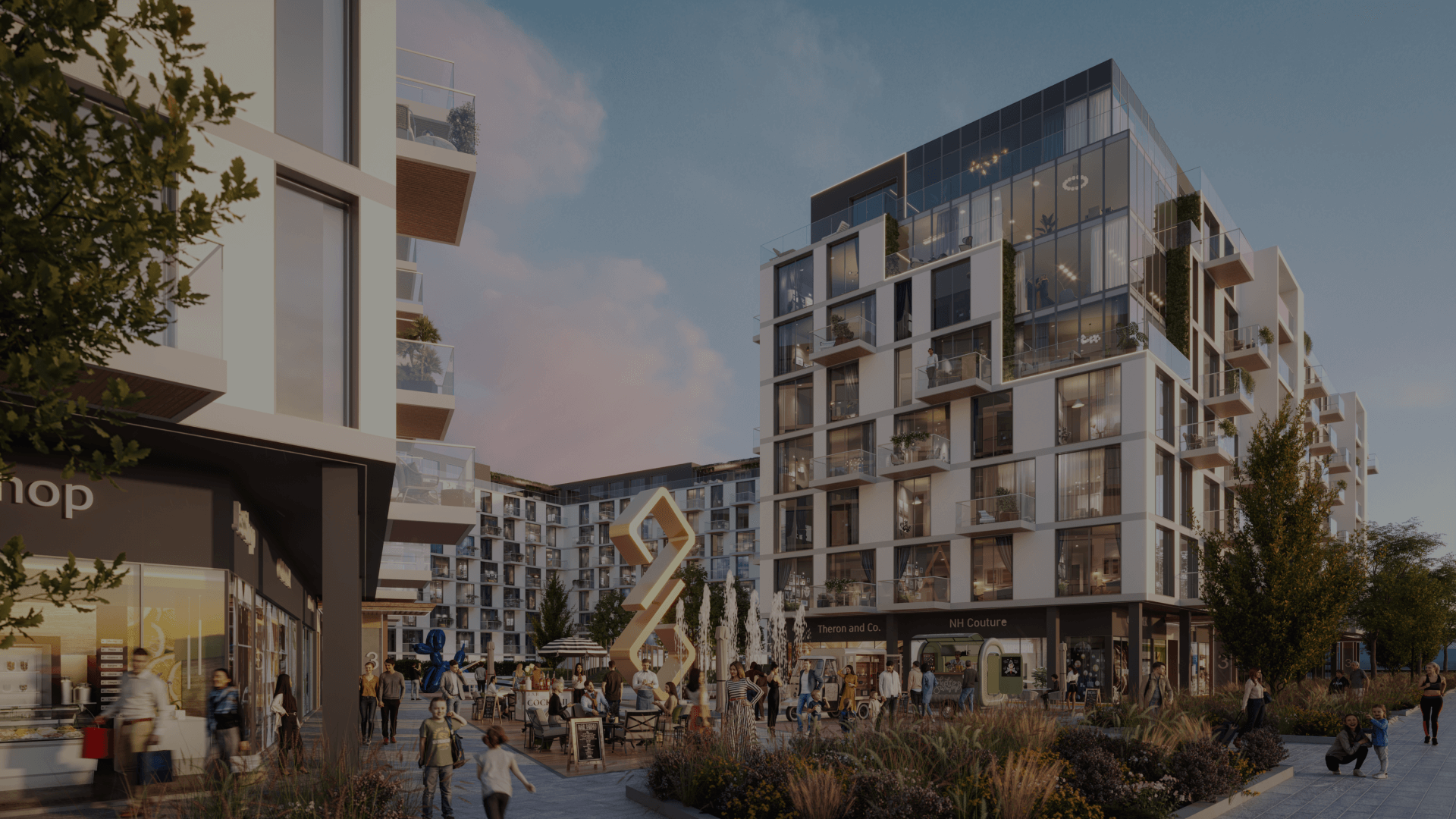 Infinity Plaza este un hub vibrant înconjurat de verdeață luxuriantă, cafenele și restaurante stilate. Piațeta oferă numeroase zone de relaxare în aer liber, creând cadrul perfect pentru a savura cafeaua de dimineață sau pentru a lua prânzul cu prietenii. Statuia Infinity și fântâna sunt piese centrale reprezentative oferind ambianță și consolidând brandul exclusivist al proiectului.